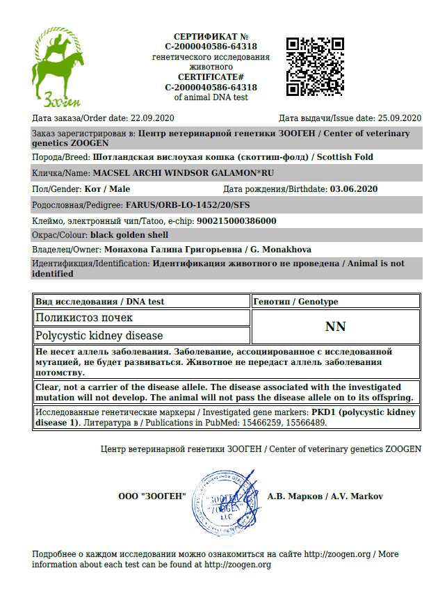 Именно поэтому все кошки нашего питомника тестированы на основное генетически передаваемое заболевание кошек – поликистоз почек (ПКД).