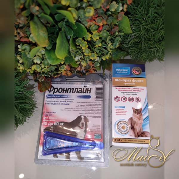 - Капли от блох и клещей. Если Вы живете в частном доме, то настоятельно рекомендуем обработать весной Ваших кошек Фронт лайн спот он. С 2022 года все котята уезжают в свои дома также и с этой обработкой. Так как в последнее время участились случаи появления блох в совершенно непредсказуемых местах. Блоха способна жить также в коврах и приноситься в сумках и на одежде. К счастью, одной обработки достаточно, чтобы решить проблему раз и навсегда. Препарат совершенно безвреден и разрешен даже беременным и кормящим. При малейшем подозрении (кошка излишне чешется и выкусывает шерсть) проще не думать, а капнуть на холку капли. Внимание! Капнуть, а не втирать. Шерсть между лопаток раздуть и нанести препарат. За час он впитается.