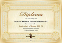 В феврале 2020 были подведены итоги выставочного сезона 2019 по версии всемирного независимого рейтинга Top Cat. Наш Винни Пух великолепно себя показал в прошлом году и стал лучшим среди всех выставлявшихся в России скоттиш страйтов!